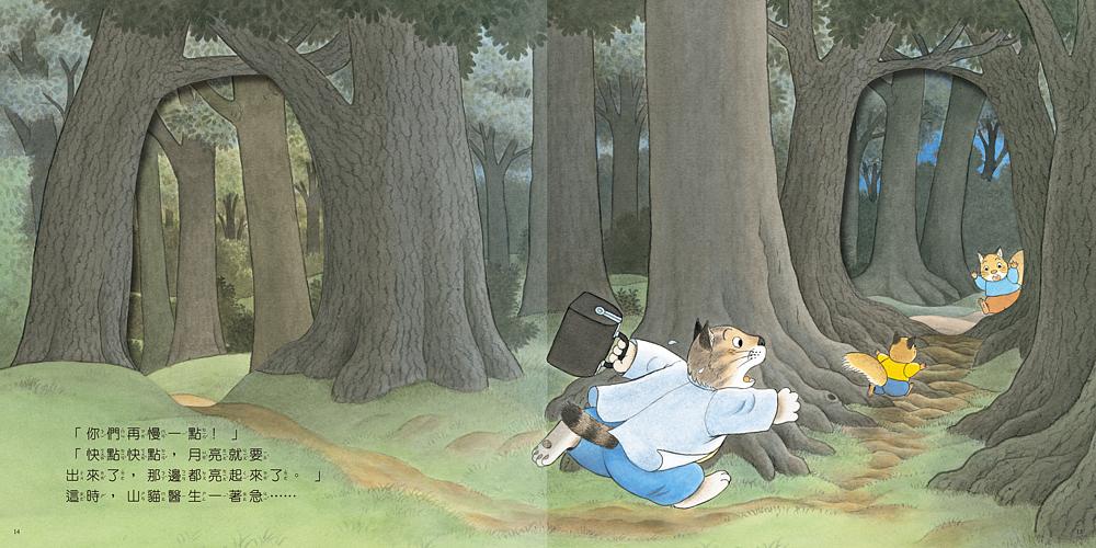 內容介紹: 剛看診結束的山貓醫生,依照松鼠媽媽的委託,帶著小松鼠,前往賞月的聚集地,不料小松鼠竟然帶著醫生走小路…反而不知道該怎麼走,於是天色越來越昏暗,慌張的他們一不小心從草叢偏滑了下去,他們會掉到什麼神祕的地方呢?
