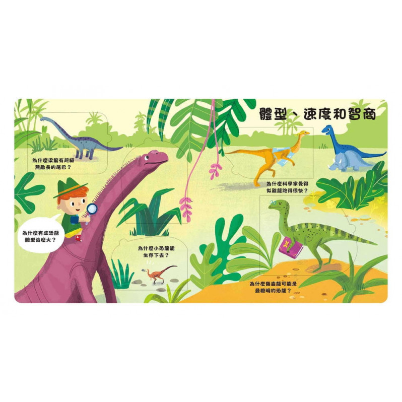 內容介紹: 翻出知識無極限,激發潛能思考力;史前恐龍大探索,好看好玩又有趣! 為什麼暴龍的手這麼短? 翼龍竟然不是恐龍? 恐龍的便便為什麼很珍貴? 恐龍為什麼消失了? 恐龍時代的地球和現在不一樣? 為什麼恐龍不吃草? 透過一問一答的方式,讓孩子動動腦,培養思考力和學習潛能;翻動小機關,鍛鍊小肌肉。翻一翻、想一想、找一找,發現恐龍真奇妙!