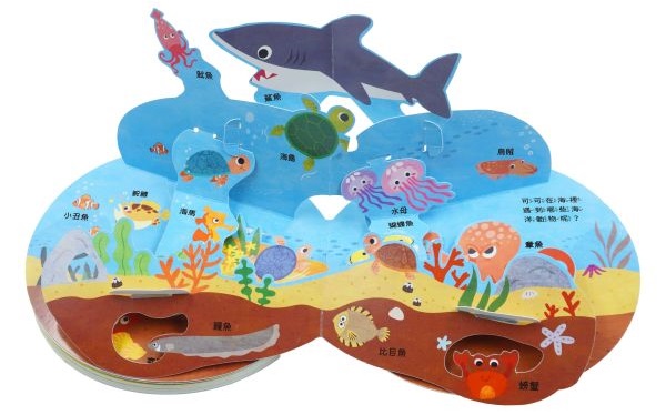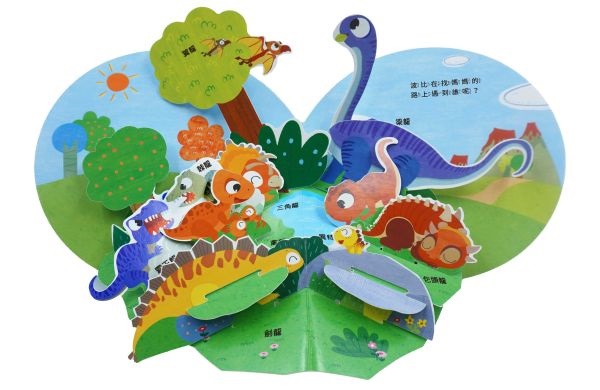 書中總共有4個立體頁和多個翻翻頁及推拉機關,豐富的互動機關吸引小朋友的注意力,讓小朋友在閱讀時,可以動手推拉翻轉互動機關,一邊玩,還可以一邊認識各種動物和恐龍!