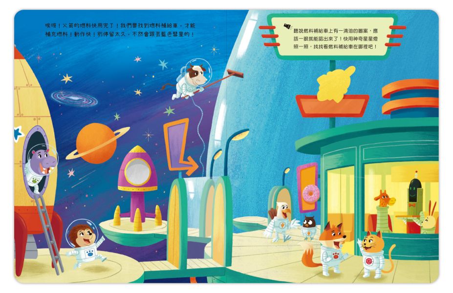 前往糖果星球的途中,動物們遇到非常多困難,他們必須完成小任務,才能抵達糖果星球,例如找到燃料補給車等,增加故事的互動性。親子共讀時,也可以和小讀者比賽,看誰找最快找到隱藏起來的藍色彗星喔!