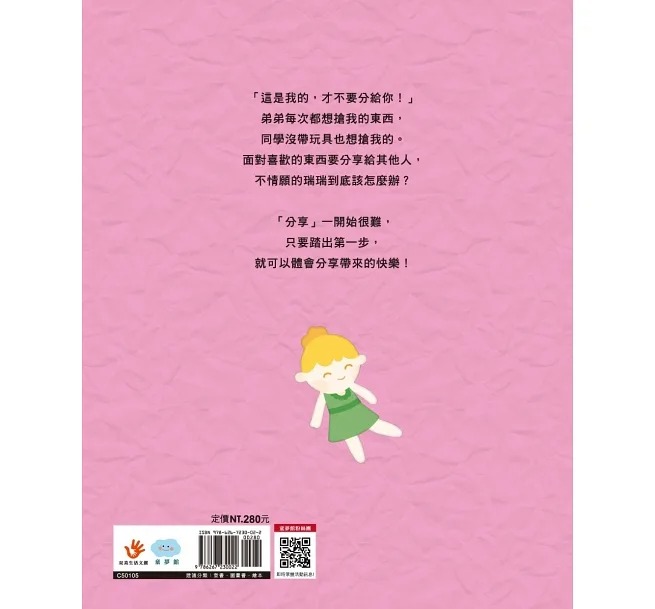 內容介紹: 一本引導孩子主動分享的品格養成繪本 一起「分享」,更好玩! 「這是我的,才不要分給你!」 弟弟每次都想搶我的東西, 同學沒帶玩具也想搶我的。 面對喜歡的東西要分享給其他人, 不情願的瑞瑞到底該怎麼辦? 「分享」一開始很難, 只要跨出第一步, 就可以體會分享帶來的快樂! 《同系列商品》 等一下,到底要等多久?培養耐心 沒問題,我可以自己來!學會獨立 有話好好說,趕走壞脾氣!情緒管理 怎麼辦?我真的不敢說!誠實面對 沒關係,我們可以一起玩!與人分享