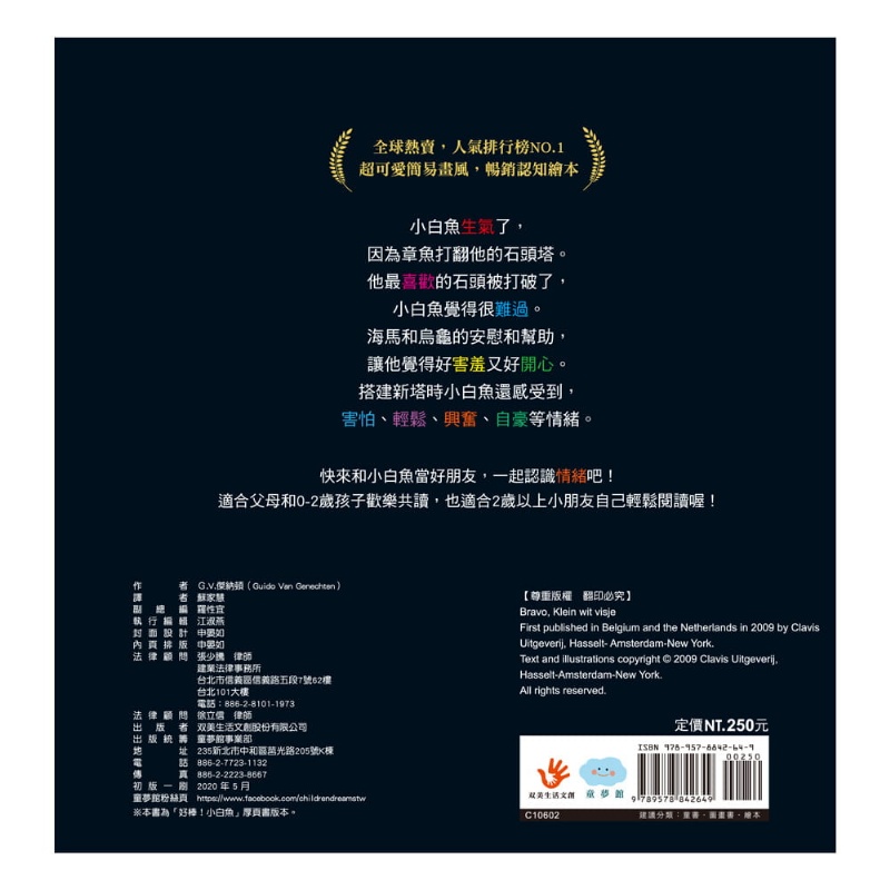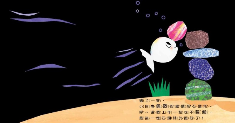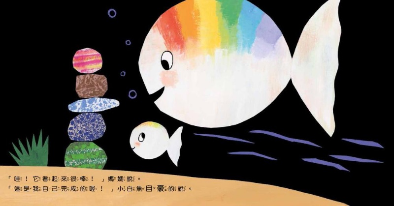 ‧刺激視覺發展:以黑色為主,搭配小白魚的白色,強烈對比,吸引寶寶目光。