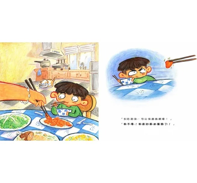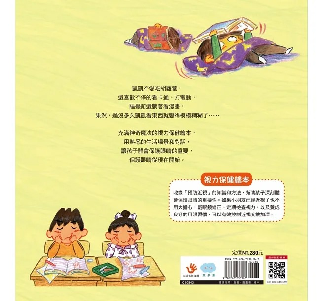 內容介紹: ★充滿神奇魔法的視力保健繪本★ \用熟悉的生活場景和對話/ 讓孩子體會保護眼睛的重要性! 凱凱不愛吃胡蘿蔔, 還喜歡不停的看卡通、打電動, 睡覺前還躺著看漫畫, 果然,過沒多久凱凱看東西就變得模模糊糊了…… 本書特色 ★童趣的畫風和豐富的色彩,吸引孩子的興趣。 ★簡單明瞭的語言和熟悉的日常對話,幫助孩子養成良好的用眼習慣。 ★內文搭配注音,當孩子學會注音,也可以試著自己閱讀此書,從中再次獲得不同感受與成就感。