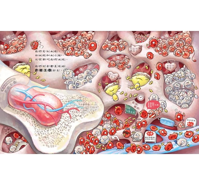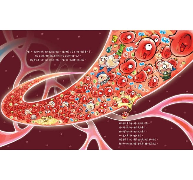 血球寶寶努力長大,要到身體星球旅行囉!他們的勇敢表現,發揮自己的才能,讓每個身體星球都能健康的成長著。勇敢的生動活潑表現吸引了大朋友、小朋友的注意,讓閱讀的人彷彿身歷其境,令人更期待故事的發展。