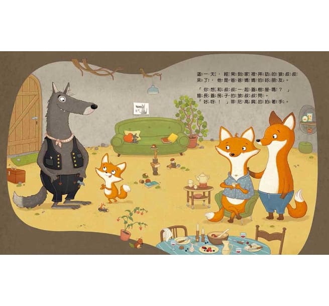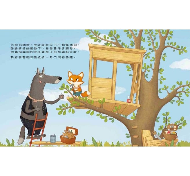 但是更喜歡和爸爸媽媽的好朋友狼叔叔一起蓋樹屋。