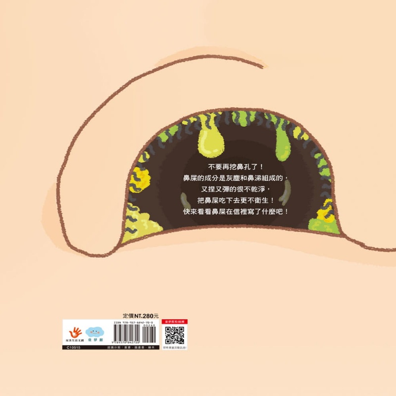 但是,你有聽過鼻屎本人寫信給你嗎?本書以詼諧幽默的角度,讓鼻屎「寫信」給小朋友,不用說教的方式,而是透過寫信傳達挖鼻孔的「種種事蹟」,例如:用手指捏鼻屎、亂彈、甚至吃下肚等等……會讓孩子會心一笑的覺得「哇!這種事我也有做過呢!」。