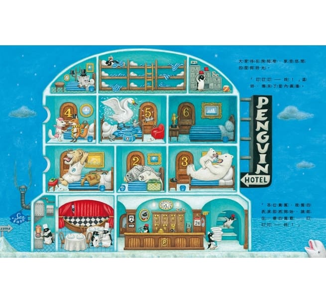 客人陸陸續續來到企鵝旅館,大廳好熱鬧,有二號房的海豹家族、三號房的北極熊親子、四號房看起來很時髦的狐狸先生不停的看著手錶,似乎在等待朋友來會合…企鵝啪噠啪噠四處招呼、非常忙碌。在夕陽餘暉中,深海中的巨無霸鯨魚也來了!要住哪裡呢?原來大海底下還有一間豪華客房。