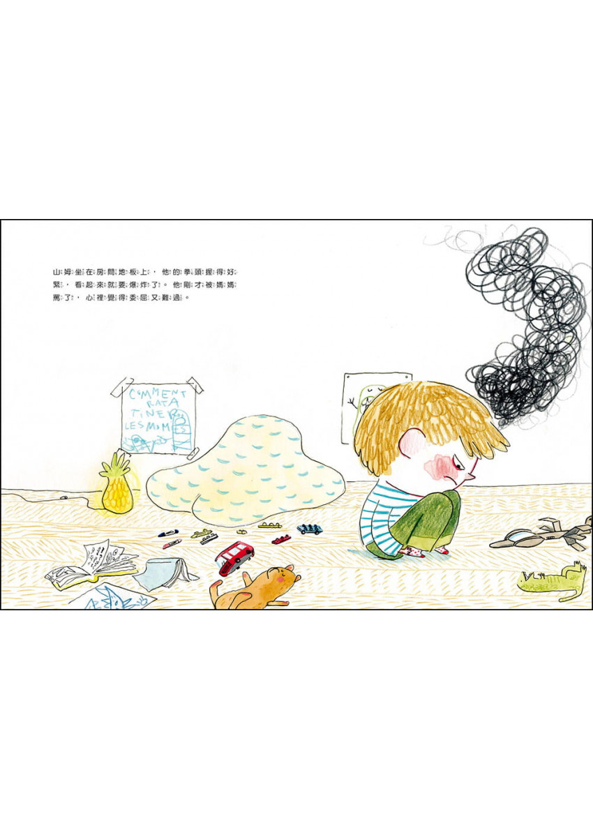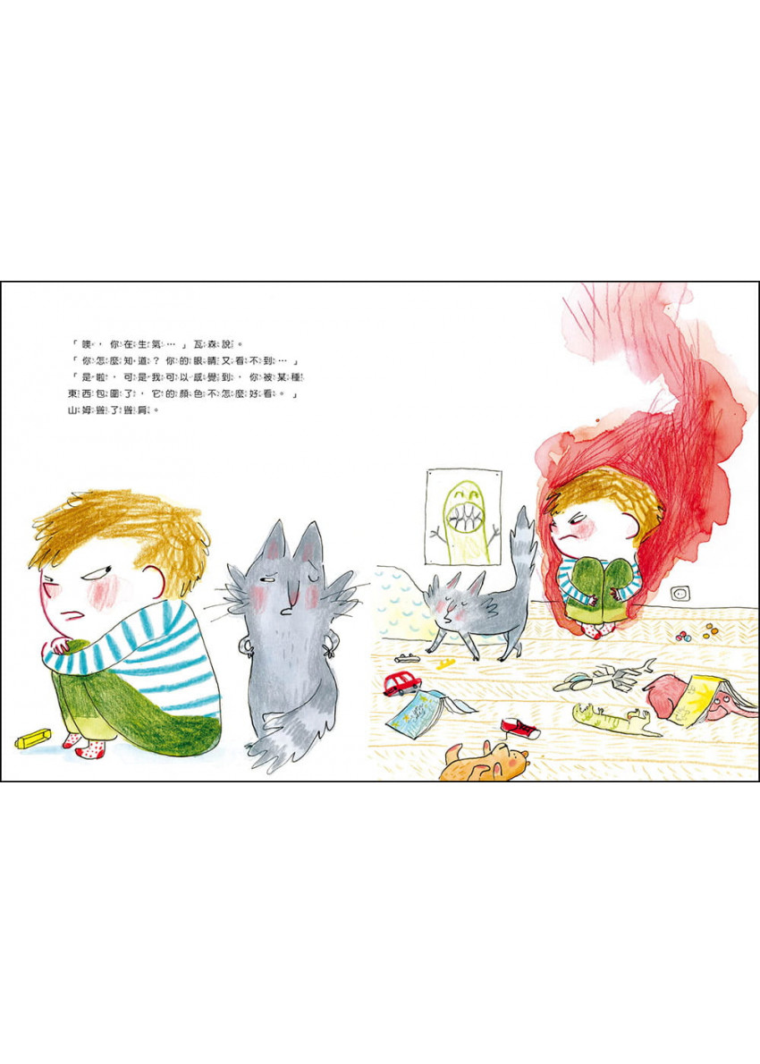 ◎山姆非常生氣,他想大吼大叫、摔東西,他將這種感覺說給貓咪瓦森聽,而瓦森則教他平息怒氣的魔法──『觀想』。觀想的概念來自瑜珈,在心理學領域也經常用到,觀想具有正面積極的力量,能讓情緒的感受變成具體可見的畫面,譬如憤怒如同火山爆發的暗紅色,生氣的時候就像腦中布滿烏雲,這時候,可以透過幾次的深呼吸來讓身體放鬆,想像烏雲逐漸被吹走,原來陽光一直都在,只是暫時被烏雲遮住了…昨天我在睡前和女兒讀這本書,我們練習「觀想」,她最後很放鬆的睡著了。──法國讀者佛朗西斯