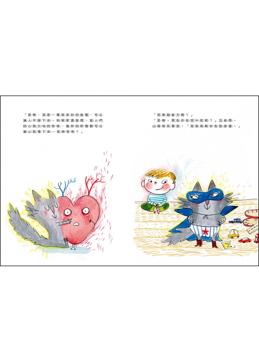 3. 貓咪瓦森用兒童能夠理解的方式說明--情緒是一種能量,而能量是可以轉化的,當心裡覺得難過或生氣時,可以透過擁抱或愛來安撫。就像貓咪在山姆身上窩成一圈毛球,發出呼嚕呼嚕的聲音,他們彼此擁抱、說一些好聽的話,交換彼此的能量(愛和擁抱有強大的能量),山姆在貓咪的安慰之下,心情也平靜下來。