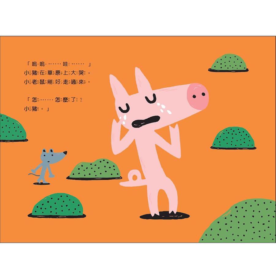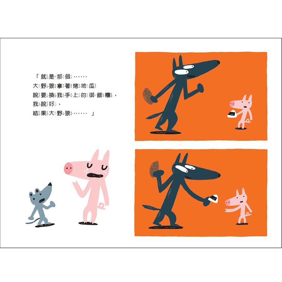「嗚嗚……哇……」有一隻小豬在草原上大哭。這時小老鼠剛好走了過來。小老鼠問小豬怎麼了,小豬說:「就是那個……大野狼拿著烤地瓜說要換我手上的御飯糰,我說好,大野狼不但沒有把烤地瓜給我,還把我的御飯糰一口吃掉了,真的好過分……」小老鼠聽完之後,就跟小豬說:「好,我去找人來幫忙!」,說完就飛快的跑走了。