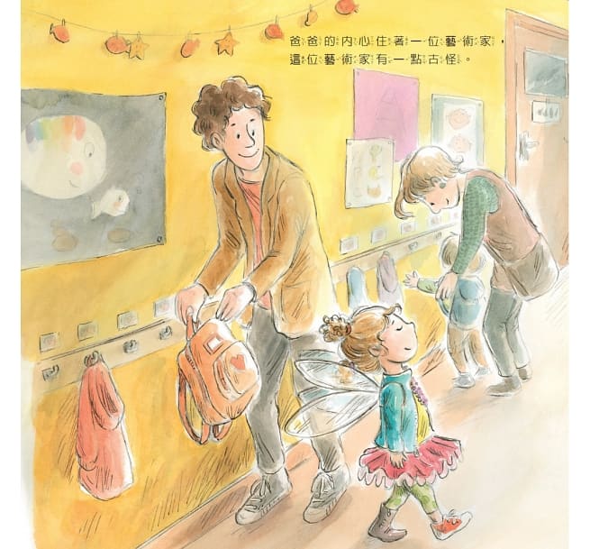 全書以孩子的口吻,詳細描繪他們眼中所看到的爸爸。有著「古怪」的藝術感、喜歡工作、喜歡搞笑、喜歡和孩子們一起玩樂……等,很適合和孩子們一起討論,你們眼中的爸爸是怎麼樣的呢?