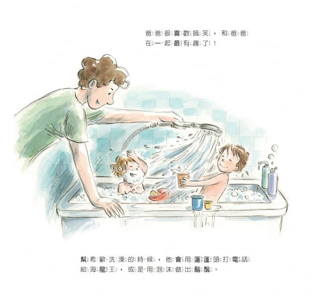 從書中的文字可以看到,爸爸是個最好的陪伴者,孩子們都喜歡和爸爸在一起,不論是在家中的浴室或是戶外的公園,爸爸總能陪著孩子們一起玩耍同樂。此外,爸爸也像是個魔術師,總是為孩子製造許多歡樂和驚喜。在他們眼中,爸爸不只是完美的爸爸,而是比完美更棒的爸爸。
