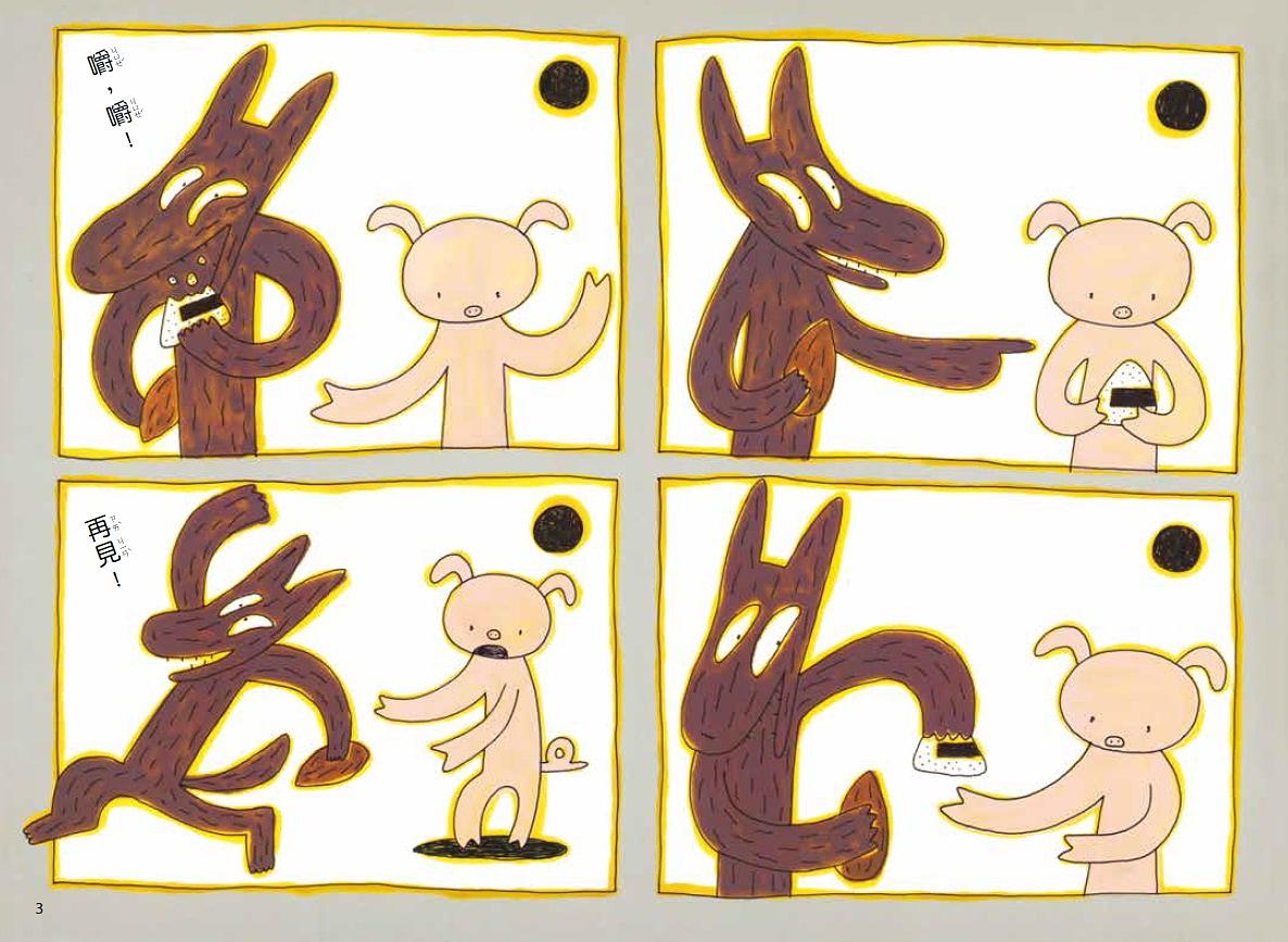 「嗚……嗚……」有一隻小豬在草原上大哭。這時小老鼠剛好走了過來。小老鼠問小豬怎麼了,小豬說:「就是那個……大野狼,拿著烤地瓜說要和我換手上的御飯糰,我答應後,大野狼不但把我的御飯糰一口吃掉了,還拿著烤地瓜跑走了,真的好過分……」小老鼠聽完之後,就跟小豬說:「這樣啊,那我去找人來幫忙!」,說完就飛快的跑走了。 接著小老鼠遇到了小白兔,小老鼠告訴他小豬可憐的遭遇:「啊,小白兔,遇見你真是太好了。就是那個……大野狼拿著烤地瓜要和小豬換御飯糰,結果大野狼不但把小豬的御飯糰吃掉了,還拿走小豬的烤地瓜。」小白兔聽完之後,也說要去找人幫忙,接著就跑走了。 小白兔後來遇到了小猴子,急忙的說:「啊,小猴子,不得了了!就是那個……大野狼把小豬變成了御飯糰,吃掉之後,又變出了烤地瓜!」