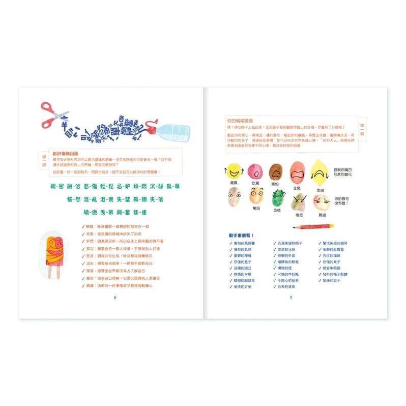 跳脫尋常的認識情緒活動,作者在書中設計的任務充滿幽默與趣味,而且每個任務都有步驟的仔細引導。像是讓孩子玩蒙眼遊戲,形容觸碰的東西,用來學習感覺的描述;把不同的情緒形容詞拆解在組合,創造出屬於自己的情緒形容詞;用媽媽的口紅在自己的身上寫下描述自己優點的形容詞,一整天都不能洗掉。不論是孩子或是大人,在進行任務的時候一定會愉快的哈哈大笑,親子一起練習,還能增進彼此的親密感。