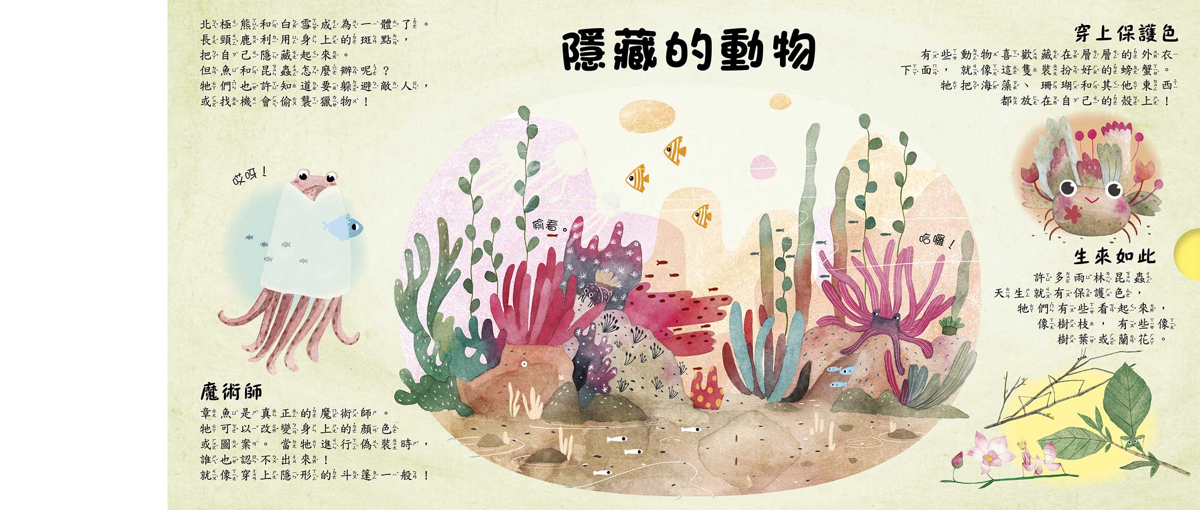 .大自然中有很多捉迷藏高手,烏龜的外殼像什麼?紅紅的章魚在廣大的海中要如何躲避敵人?這是一本親子互動的拉頁科普書。