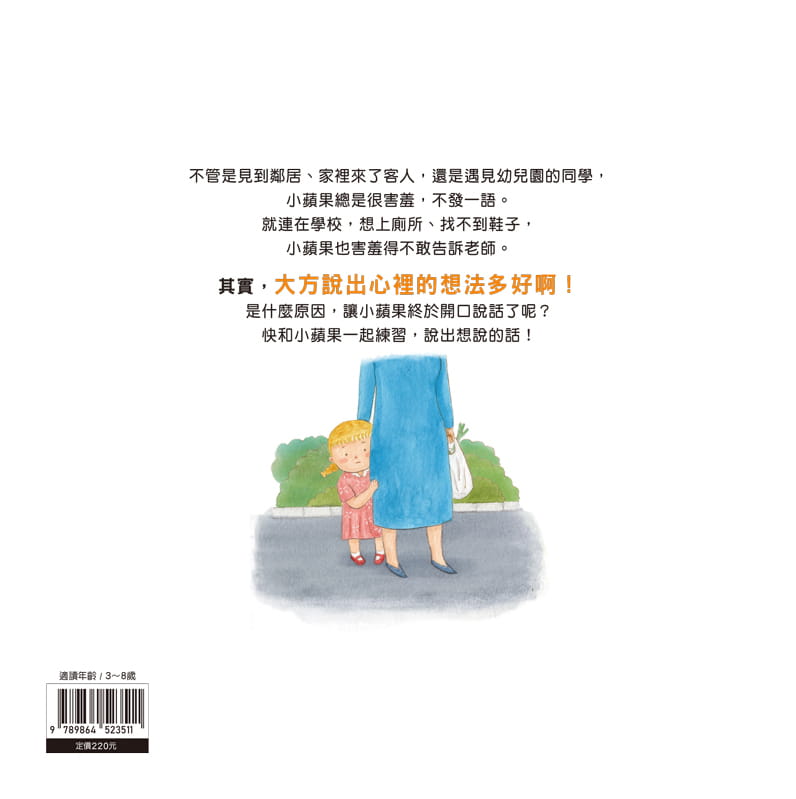 2.生活化故事內容:和生活息息相關的故事,才最能產生共鳴。故事內容正是孩子會親身遭遇的事,讓我們跟著主角小蘋果,一起練習「我不害羞,我要大方的說」。