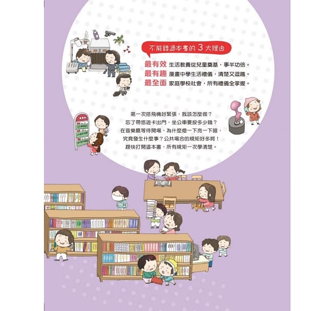 內容介紹: 不能錯過本書的3大理由: ◆ 最有效——生活教養從兒童奠基,事半功倍。 ◆ 最有趣——漫畫中學生活禮儀,清楚又逗趣。 ◆ 最全面——家庭學校社會,所有禮儀全掌握。 第一次搭飛機好緊張,我該怎麼做? 忘了帶悠遊卡出門,坐公車要投多少錢? 在音樂廳等待開場,為什麼燈忽明忽暗, 究竟發生什麼事?公共場合的規矩好多呵! 趕快打開這本書,所有規矩一次學清楚。