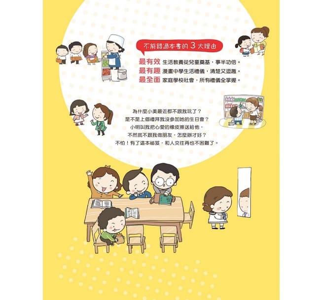內容介紹: 不能錯過本書的3大理由: ◆ 最有效——生活教養從兒童奠基,事半功倍。 ◆ 最有趣——漫畫中學生活禮儀,清楚又逗趣。 ◆ 最全面——家庭學校社會,所有禮儀全掌握。 為什麼小美最近都不跟我玩了? 是不是我上個禮拜缺席她的生日會了? 小明叫我把心愛的橡皮擦送給他,我該怎麼辦? 不怕!有了這本祕笈,和人交往再也不是困難的事了。