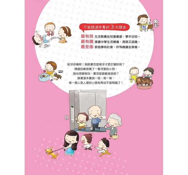 內容介紹: 不能錯過本書的3大理由: ◆ 最有效——生活教養從兒童奠基,事半功倍。 ◆ 最有趣——漫畫中學生活禮儀,清楚又逗趣。 ◆ 最全面——家庭學校社會,所有禮儀全掌握。 蛀牙好痛呵!到底要怎麼刷牙才是正確的呢? 隔壁的鄰居養了一隻可愛的小狗, 我也想跟牠玩,要怎麼跟鄰居說呢? 跟著這本書說一說、做一做, 你一也可以成為一個人見人愛的小朋友呵!