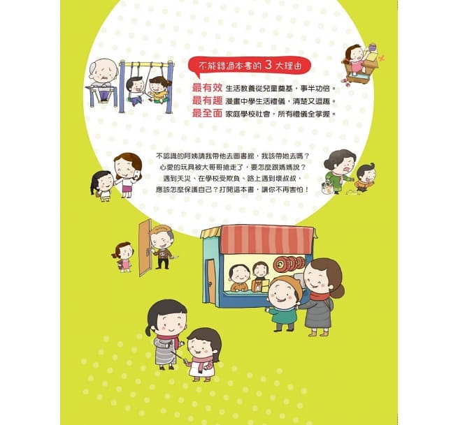 內容介紹: 不能錯過本書的3大理由: ◆ 最有效——生活教養從兒童奠基,事半功倍。 ◆ 最有趣——漫畫中學生活禮儀,清楚又逗趣。 ◆ 最全面——家庭學校社會,所有禮儀全掌握。 不認識的阿姨請我帶他去圖書館,我該帶她去嗎? 心愛的玩具被大哥哥搶走了,我要怎麼做才好? 遇到天災、在學校受欺負、路上遇到壞叔叔, 我要怎麼保護自己?打開這本書,讓你不再害怕!