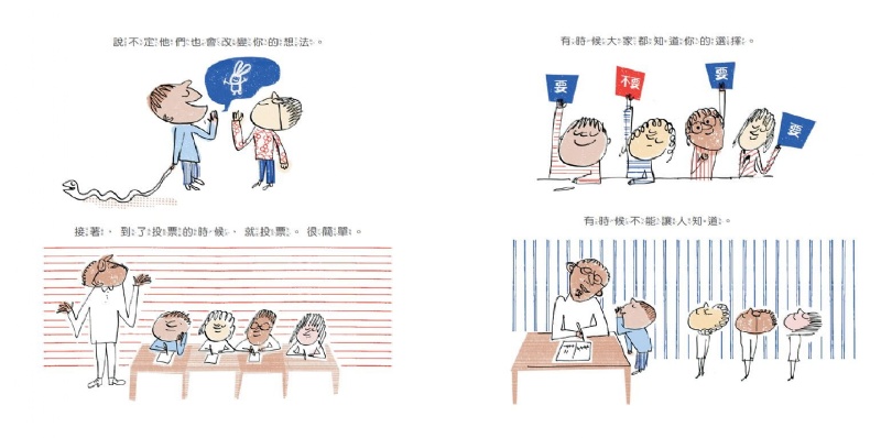 這本繪本用最平易近人的方式,帶孩子從生活事例看懂投票和選舉。先從孩子喜歡的食物開始,點出選擇和投票的關聯,接著延伸到當大家必須一起做選擇時,要如何表達想法、爭取支持、仔細衡量資訊,並以理性接納結果。最後再利用同樣的核心概念介紹大人的選舉,同時也告訴孩子即使沒有投票權,還是有自己參與的方式。書末並附有臺灣選舉方式及政府組織的相關介紹,讓孩子更清楚選舉前後可以關注那些事。