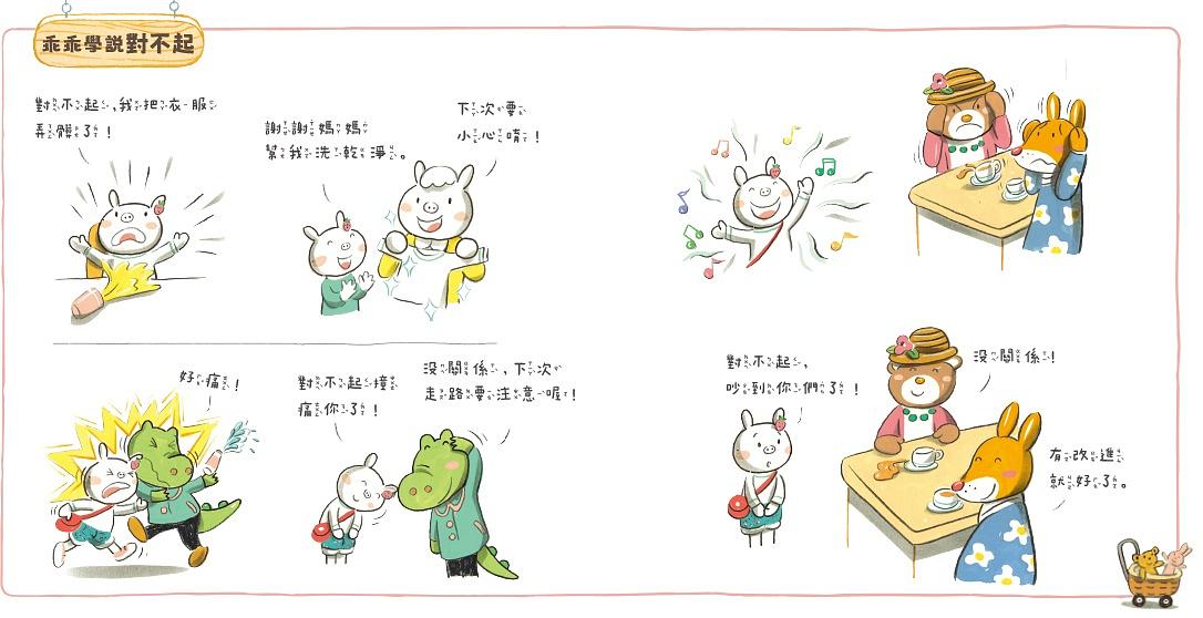 特色3 切中幼兒發展痛點,主題訴求鮮明:說對不起(學習同理心)/不怕打針(恐懼看醫生、害怕打針) /慢吞吞(時間管理、優先順序)/溜滑梯(交友、人際)/坐小馬桶(戒尿布)/愛幫忙(愛模仿、懂禮貌)。