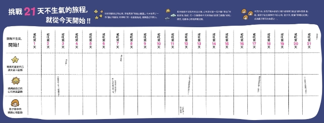 特色1:書衣背面附挑戰21天不生氣「心情記錄表」,可貼於冰箱或每日必經之處,提醒每日預留寵愛自己時間,並每晚為自己的情緒把脈。