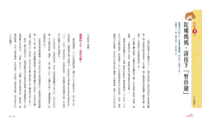 如在「好好愛自己」篇章,本書幫助媽咪從最基礎的照顧自我情緒出發,除理解自己為什麼會生氣、不逼迫自己一定要成為超完美A+媽媽外,也從好好哭、助眠習慣、創造寵愛自己時刻等角度,提供多道消除媽媽壞心情的消氣解方。在「婚姻不氣爆」篇章中,媽咪可學到如何在婚姻中理解、同理另一半,了解如何創造正向的夫妻溝通模式,甚至如何向爸爸學習「斷捨離教養」、「無罪惡感育兒」。至於日常生活中更實際的有效親子溝通等議題,在「變身戒吼媽」部分則有非常務實的教養提案,從具備心理學研究基礎的教養建議出發,理解不同階段孩子的身心發展狀態,幫助父母用更科學的方式,擺脫「總是講不聽」的困擾,朝不必怒吼而能有效溝通的境界邁進。