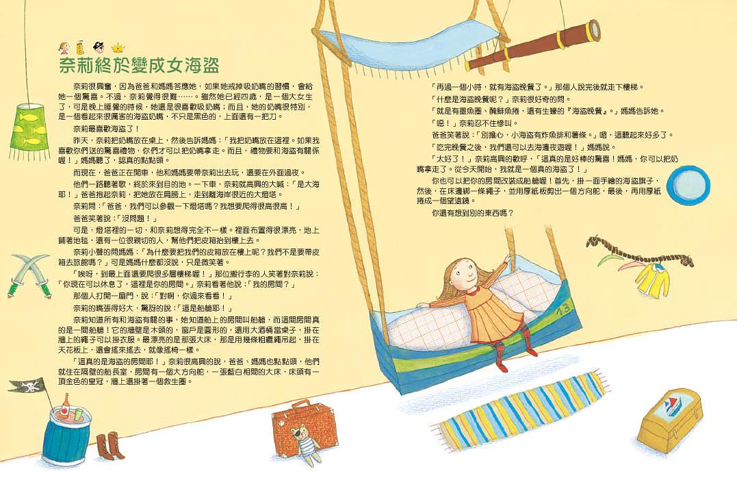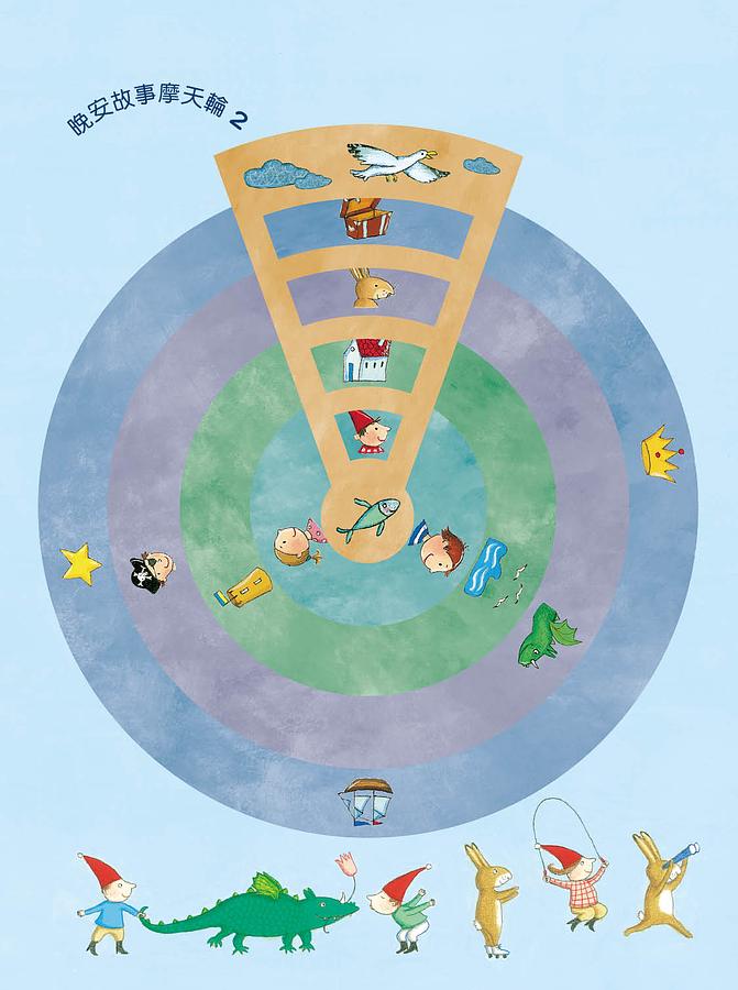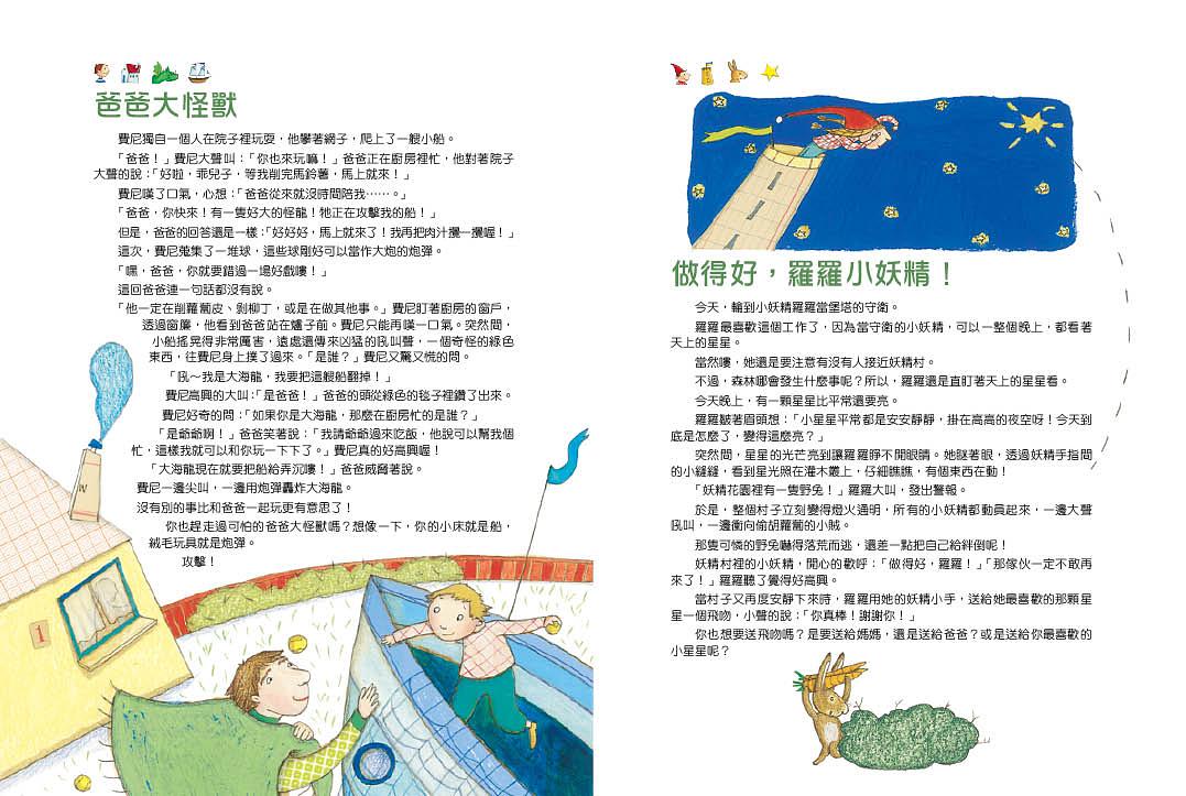 內容介紹: 想聽什麼故事,由孩子自己來決定! 4個轉盤,13個角色、事物和故事場景, 交織出108個好聽、好看、好讀的晚安故事! 快來跟著小精靈一塊在天空中飛翔, 再隨著小仙女到處尋找新奇事物, 接著和其他孩子一起去湖邊或城堡裡探險。 淡淡月光下,每晚都有新鮮事! 聽完晚安故事後,跟著主角一起閉上眼睛, 做個甜甜的美夢吧! 系列特色: ★德國超人氣晚安故事大全,孩子睡前必備的床頭書 在德國享有超高人氣,是孩子睡前必備的床頭書。「3分鐘1個故事」,讓你和孩子一起度過無數有趣的夜晚。 ★首創「說故事點唱機」遊戲,讓孩子同時享受「聽」與「玩」的閱讀樂趣 本書首頁附有4個轉盤、13個故事主角與場景,任你自由搭配,變換出108個「晚安故事」。你,就是今晚的故事DJ! ★延伸創意,用主角說一個自己的故事,培養邏輯思考與敘事表達 除了書裡的故事,你也可以隨意選擇轉盤上的圖案自由發想,創造自己的故事。讓想像力盡情奔馳!又聽又玩,閱讀的方式不只一種,也可以很多元! 【遊戲方法】 ■步驟1:轉動四個遊戲轉盤,找到想要的故事主角和場景圖案。 第1層轉盤:小男生、小女生、小老鼠 第2層轉盤:森林、城堡、湖邊 第3層轉盤:驢子、精靈、小仙女 第4層轉盤:泰迪熊、鑰匙、腳踏車、月亮 ■步驟2:在目錄裡找出由這四個圖案所組成的晚安故事。 ■步驟3:聽完晚安故事,跟著主角一起閉上眼睛,做個甜甜的美夢吧!