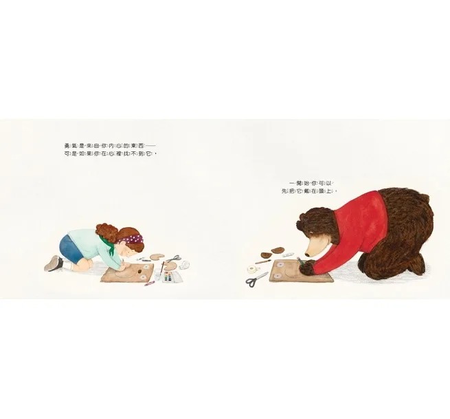 一個關於「嶄新經驗」的可愛溫暖又充滿寓意的故事:面對未知的情境與恐懼害怕的事物,在繪本裡當然不是少見的題材,不過書中藉由「搭火車」與「勇氣帽」的意象,來串接兩位乍看很不一樣的主角──小女孩和熊──從害怕到集聚勇氣的心路歷程,無論是文或圖,都在別具趣味的對照中,既富有詩意又留下寬廣的想像空間。