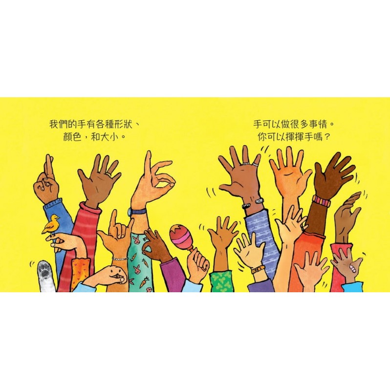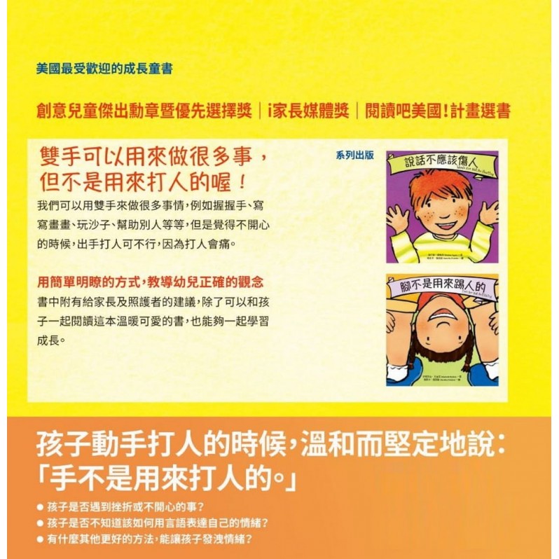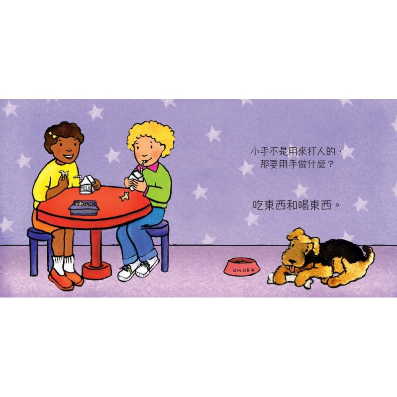 我們可以用雙手來做很多事情,例如握握手、寫寫畫畫、玩沙子、幫助別人等等,但是覺得不開心的時候,不能動手打人,因為打人會痛。