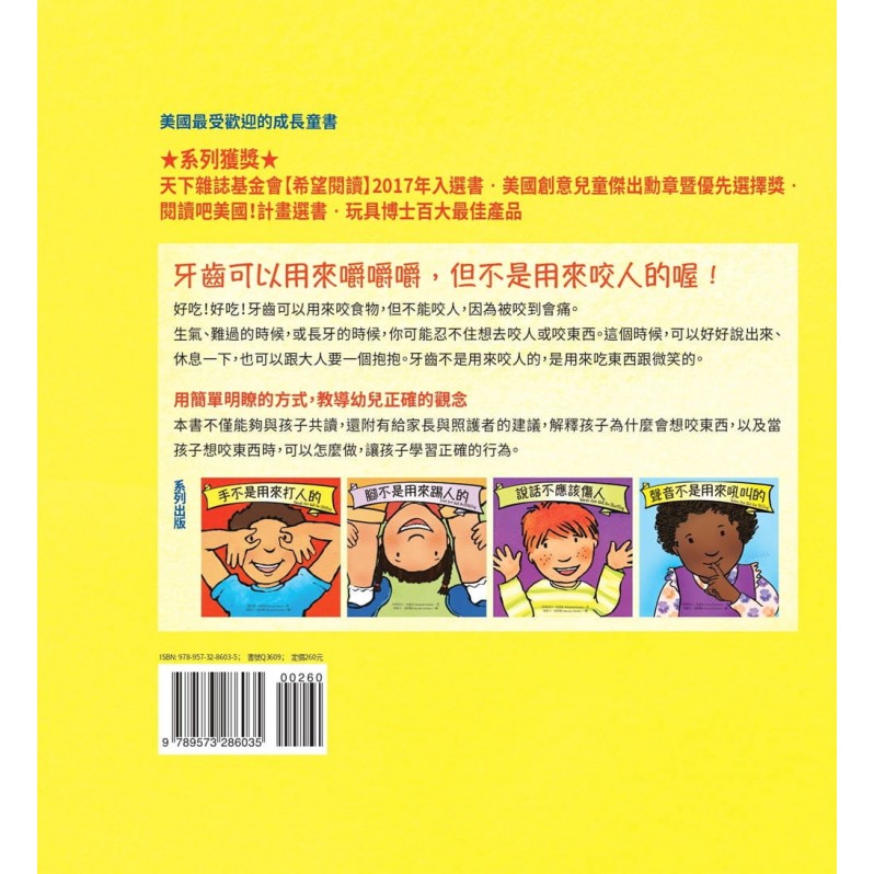 生氣、難過的時候,或長牙的時候,你可能忍不住想去咬人或咬東西。這個時候,可以好好說出來、休息一下,也可以跟大人要一個抱抱。牙齒不是用來咬人的,是用來吃東西跟微笑的。
