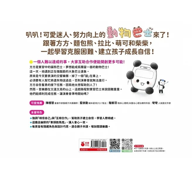 無論是努力認真的主角貓熊巴士-方方、可靠的熊巴士-麵包熊、可愛的兔子巴士-拉比、愛打扮的貴賓狗巴士-萌可等,就像孩子人生中會遇到的每一位朋友,這些不同個性的好夥伴,即將一起創造有趣又豐富的巴士實習生活。