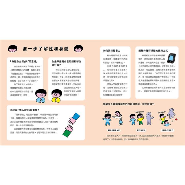 不同於其他性教育繪本,除了教導孩子了解身體以外,本書更進一步依據國際性教育指導學習目標中所提到的「自己有權利決定『不要』讓其他人隨便碰觸自己的身體」的概念,讓孩子透過了解「身體的權利」,重視自己與他人的身體,並且學會相互尊重。
