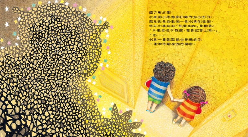 他們買滿了各式各樣的糖果,心滿意足的搭電梯回家,