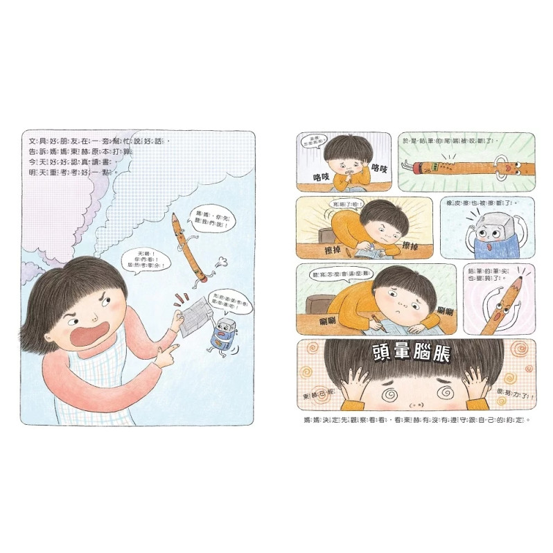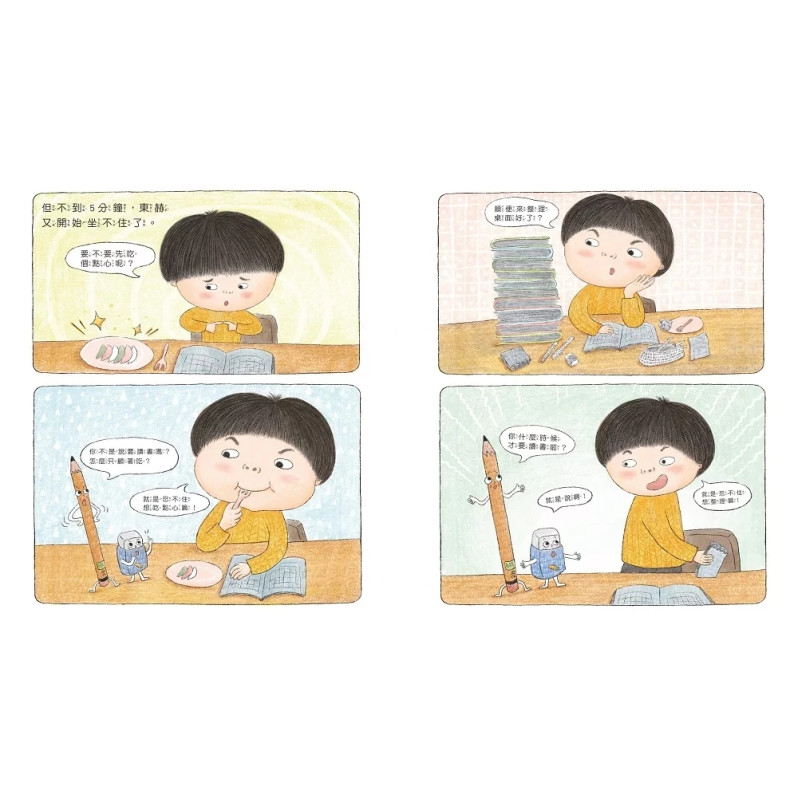 3、充滿童趣想像力:鉛筆、橡皮擦等文具好朋友,化身學習戰友,帶來支持。
