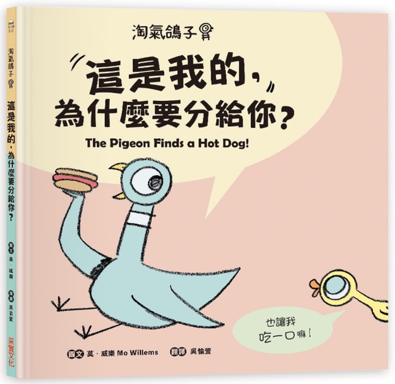 小鴿子撿到一支熱狗,不管小鴨怎麼說,他就是不願意分享一口給小鴨。這就像孩子常有獨佔事物的表現,總是對於手上擁有的十分執著。當與兄弟姊妹、校園群體相處時,懂得分享、禮讓也是社交的一環。有別於一般分享主題的繪本,讀者能在鴿子與小鴨一來一往的攻防戰中,被書中角色逗得哈哈大笑,並理解分享的樂趣,偶爾也能因此交到好朋友喔!