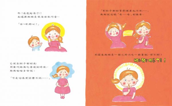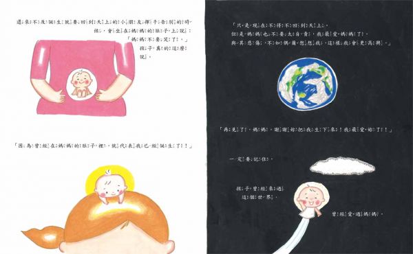 ★ 有一些還來不及誕生就要回到天空的小孩,在揮手告別時坐在媽媽的肚子上,安慰和感謝──媽媽不要哭了。因為曾經在媽媽的肚子裡,就代表我已經誕生了!我最愛媽媽了!再見了,媽媽!謝謝妳把我生下來,我最愛妳了!