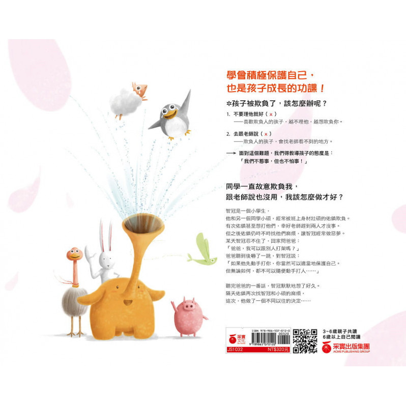 「被欺負時,該怎麼做呢?」其實每個孩子在成長過程中,或多或少都會遇到這樣的問題。對孩子來說,這是一個能進一步學習成長的機會。透過本書貼近真實的故事,孩子會知道面對不合理時,該怎麼做,學習判斷情勢,找到反擊的機會,學會為自己勇敢,同時也懂得同學間必須互相尊重和幫助。