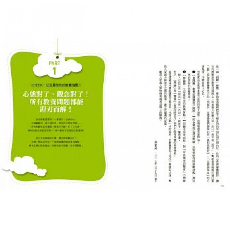 3. 每一部前均教養情境檢測表或發展特色與常見問題,以及教養觀念實踐SOP圖,簡單易懂好吸收。