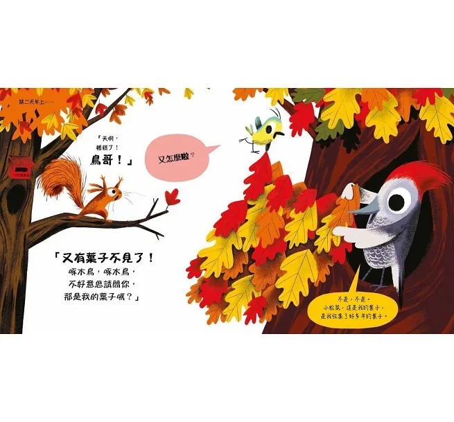 ◇畫面活潑、故事流暢:松鼠超誇張語氣&鳥哥的超淡定表情,活靈活現表現出孩子東西不見了的著急,大人覺得沒什麼大不了的冷靜,兼具故事張力與美感。