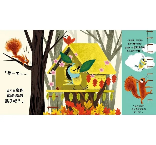 鳥哥實在受不了了,只好帶著小松鼠到處去找「有嫌疑」的葉子小偷,