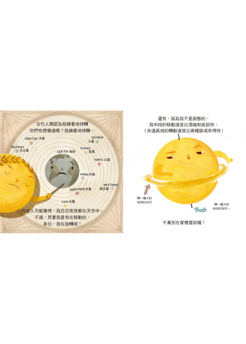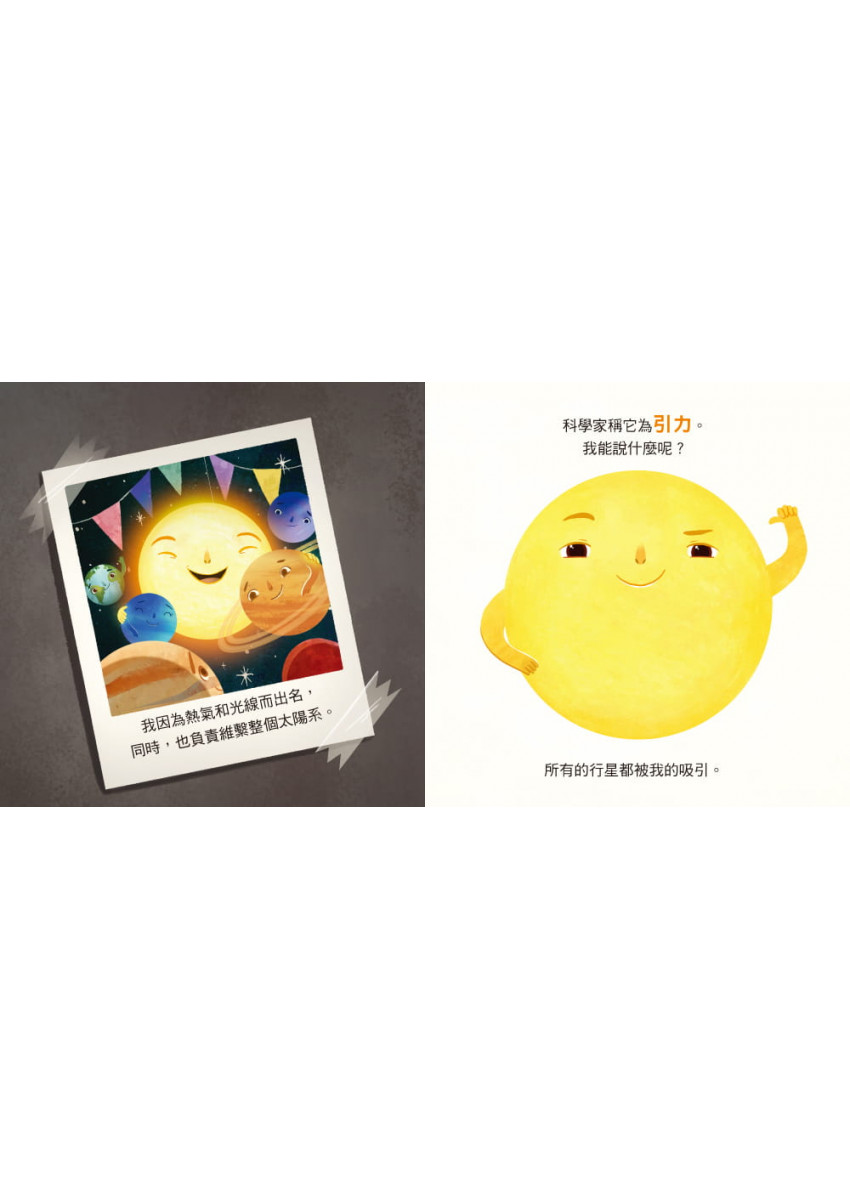 本書中介紹太陽的基本結構組成,透過圖文並茂的方式,讓小讀者能夠迅速學習到和太陽相關的知識,並且透過圖片深植小朋友的記憶中。