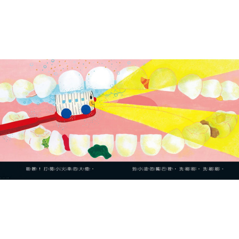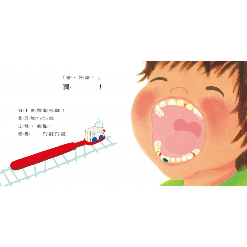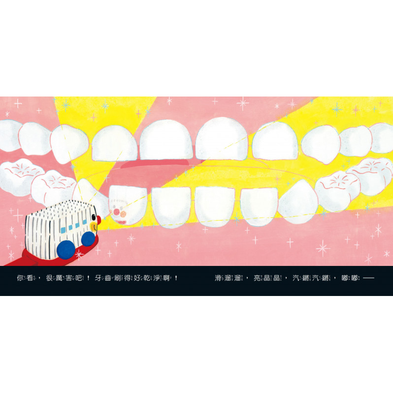 刷牙號小火車打開大燈,照著嘴巴裡的菜渣、玉米粒,還有難纏的肉渣……