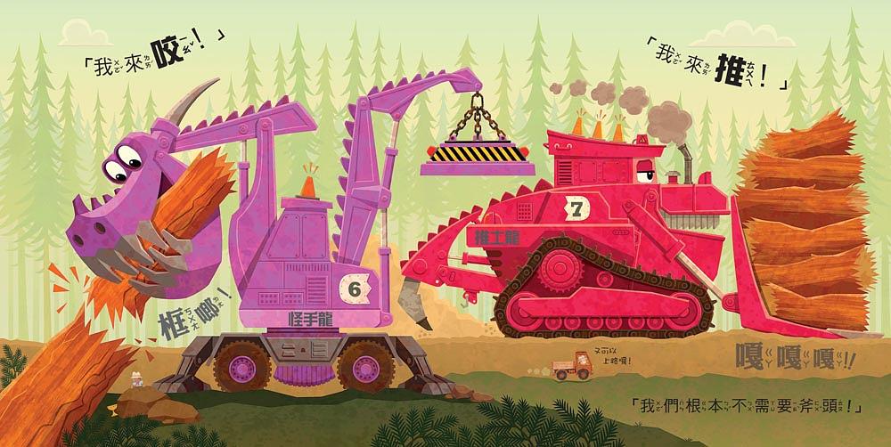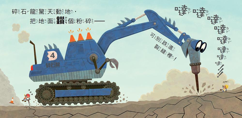 車輪挖土龍大口挖土、推土龍又抬又推、鐵球起重龍大力敲,鑽孔龍用力一鑽……