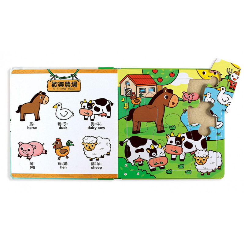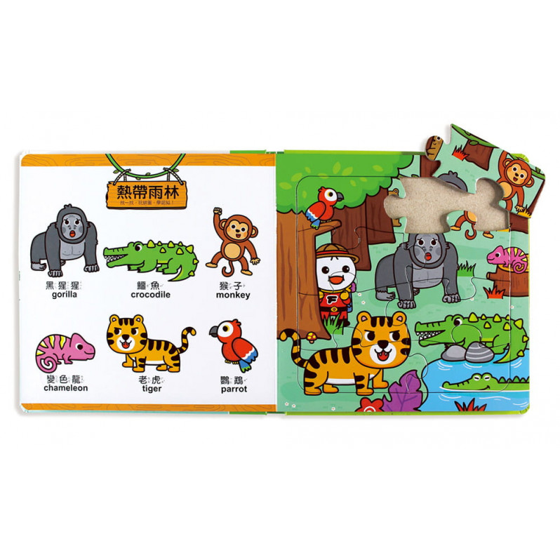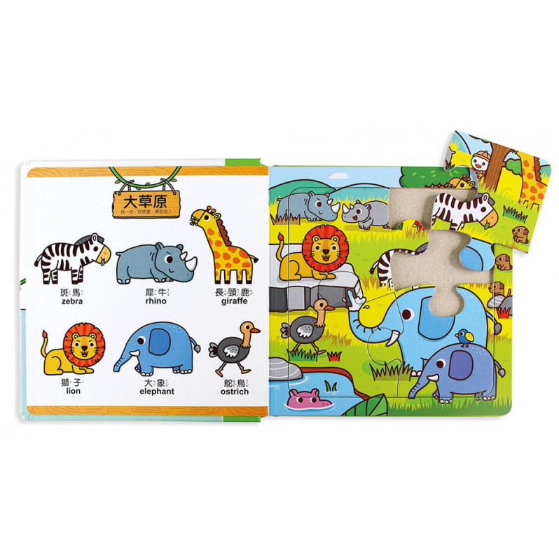 完成拼圖後,可學習中英文單字,並玩一玩「尋找遊戲」,找找看旁邊的語詞藏在拼圖哪個地方,不僅好玩又能學認知,考驗孩子的觀察力,並從小培養語文基礎,擴充詞彙量。