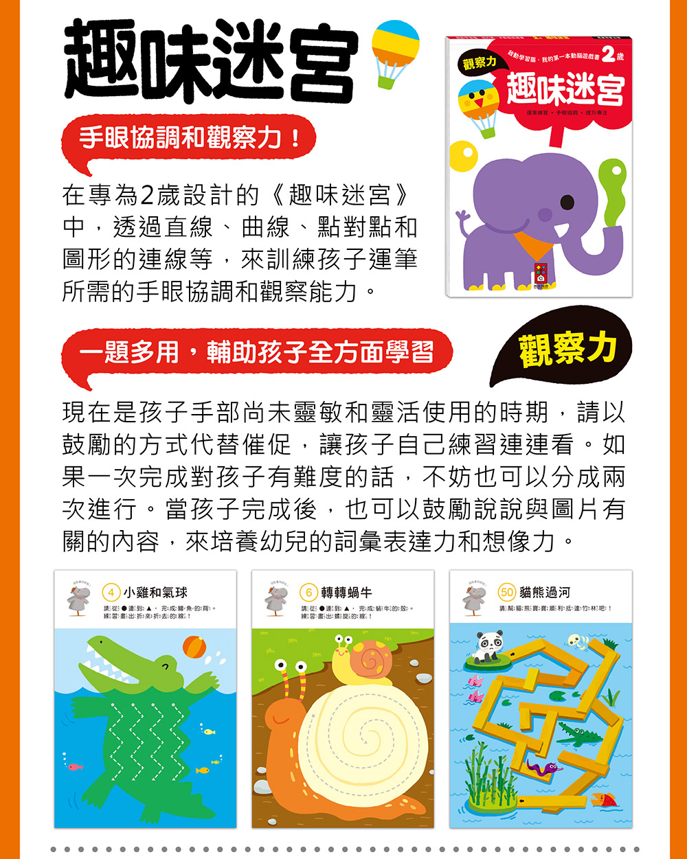 專為學齡前幼兒設計的遊戲題型,適合2~5歲的訓練主題及目標,一步步幫助孩子找到學習成就感。