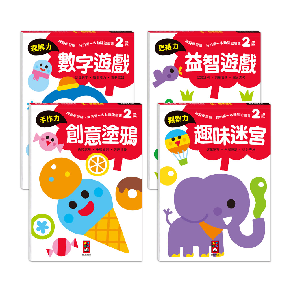 內含4冊練習本:《2歲數字遊戲》、《2歲益智遊戲》、《2歲趣味迷宮》、《2歲創意塗鴉》