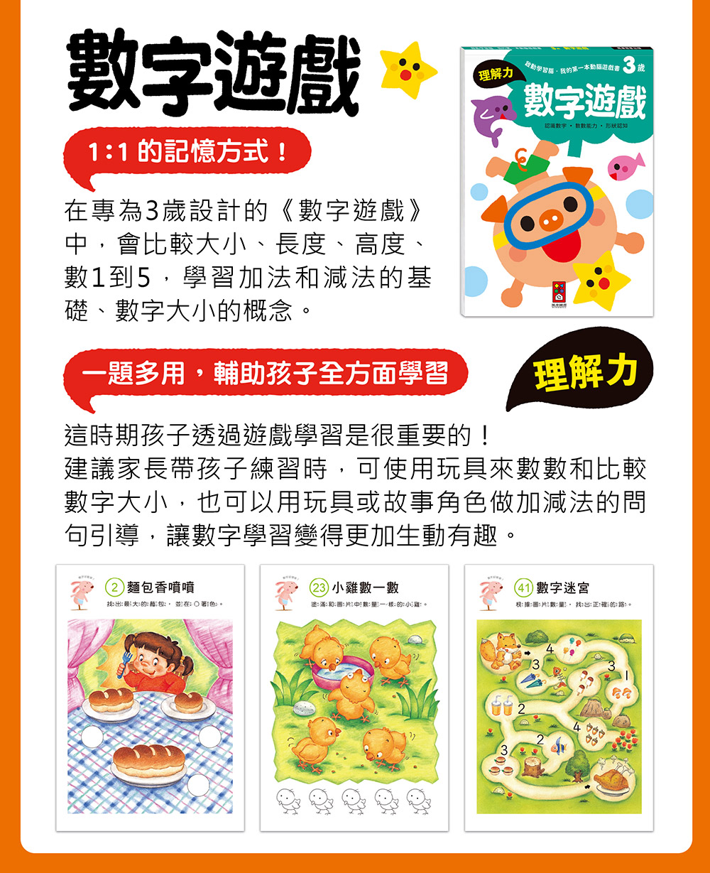 《數字遊戲》:5以內數序、數數和數量,熟悉基礎數學。