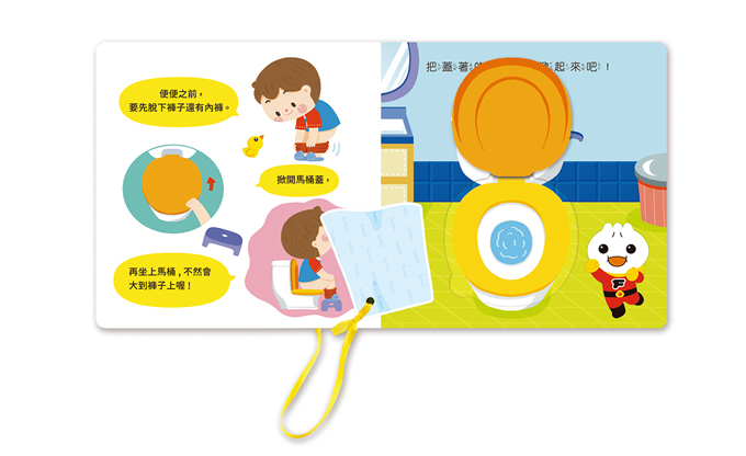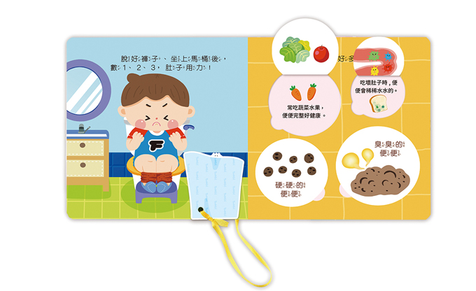 3. 貼心沖水馬桶把手設計──書內含有貼心馬桶沖水把手,可讓孩子自行壓下馬桶沖掉便便,能更與日常生活連結,養成整潔自律行為。